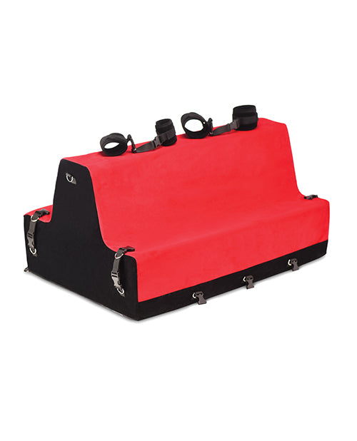 Enjoy longer scenes and more comfortable kink with this Love Bench! Never before has there been such an easy to use and ergonomic bondage bench. Designed so your torso and lower limbs are fully supported but cushioned at the same time. Don't sacrifice your time and desires by playing with furniture that doesn't allow for superior comfort! You can choose what type of pain you might enjoy without succumbing to numb hands and aching knees with high-density foam that is firm enough to lift you up but not so soft that you sink into the pillow. This vibrant red and deep black bench is easy to move around and can be placed on the floor or a bed to play on. With 12 different attachment points you still enjoy playing while restrained. The bench includes 2 wrist cuffs, 2 ankle cuffs, 3 connectors with D-rings and 2 restraint connectors. Due to the bench being softer than a hard wood or metal bench, you can also explore more positions that your body would normally allow you to! The velvety soft outer cover feels luxurious against your bare skin and the water-resistant inner cover protects the foam from water, spills and moisture so you can enjoy this item for years to come. Both covers are machine washable so you can easily care for your new favorite bondage bench!