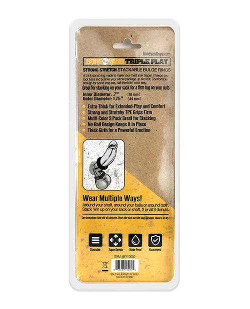 Extra thick and comfortable the Triple Play Cock Ring contains the 3 perfect size donut rings.  Each kit contains a black, clear, and smoke colored ring, intended to be worn around cock, balls or both.  They are made of super strong and stretchy TPE and are phthalate free.  The Triple Play Cock Ring are soft, stretchy, easy to get on, and help you keep a firm and hard erection.