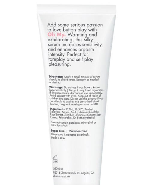 Add a bit of warming buzz and enhance clitoral stimulation with the "Oh My" Clitoral Warming Stimulant serum from CG. The serum is formulated to generate an exhilarating warming effect when applied that increases sensitivity and arousal. CG's "Oh My" Clitoral Warming Stimulant is sugar-free, paraben-free, and made in the USA.
