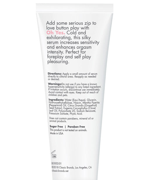 Add some serious zip to love button play with Oh Yes. Cold and exhilarating, this silky serum increases sensitivity and enhances orgasm intensity. Perfect for foreplay and self play pleasuring. Apply a small amount of serum directly to clitoral area. Reapply as needed or desired. Cooling and tingly serum, ideal for clitoral arousal and enhanced sensation. Formulated to enhance orgasm intensity. Fragrance Free. Ideal for toy, self and couple's play. This product does not contain gluten or sugar. This product does not contain parabens or mineral oil. This product is not tested on animals. Made in the USA.