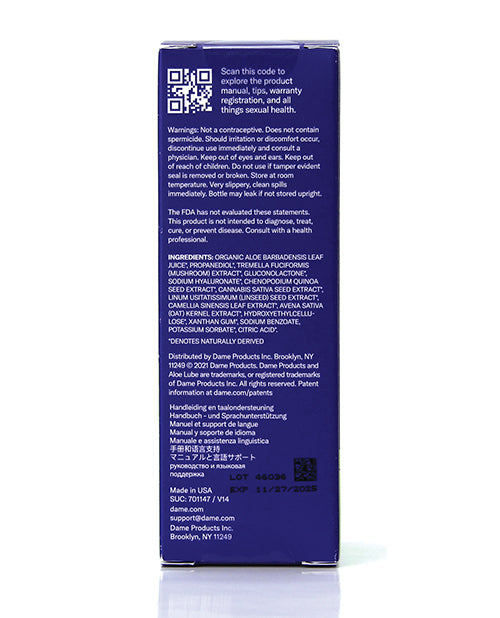 Alu from Dame is Water-based from organic aloe vera, which means it's safe for toys and most condoms! Plant-derived, organic, and pH-matched to vaginas. Free of glycerin, parabens, hormones, or sugars. Pump bottle small enough for single-handed pumping. 4 ounce bottle. pH: 4.