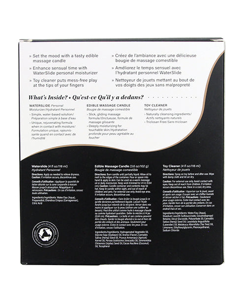 Our Play & Pleasure set includes the basics you'll need for any fun fantasies you want to explore and enjoy. WHAT'S INSIDE? Waterslide Personal Moisturizer Our Waterslide is the simplest, purest personal moisturizer. This unique formula that includes water and carrageenan rejuvenates when it comes into contact with moisture, whether it be your own natural lubrication or saliva ensuring that one application will last through any night. With just four ingredients, Waterslide provides a slick glide with minimal irritants, making it ideal for those with increased sensitivities. 3-in-1 Edible Massage Candle Our 3-in-1 Edible Massage Candle melts down into a sensual massage oil with a subtle hint of flavor when licked off. It is specially formulated to melt a couple of degrees above body temperature to keep things warm as it seeps into the skin. Its unique blend of natural oils provides a professional slip that moisturizes skin and gives it a healthier-looking glow. Toy Cleaner Our Toy Cleaner is an essential product for keeping you and your toys clean and well cared for, so you can have the freedom to enjoy yourself with or without a partner. Essential oils like Tea Tree, Lavender, and Hemp Seed act as advanced cleaning agents to keep your toys and your skin ultra-clean, soothed, and irritation-free. It is a safe and effective way to clean toys before and after use, so they're always ready for action.