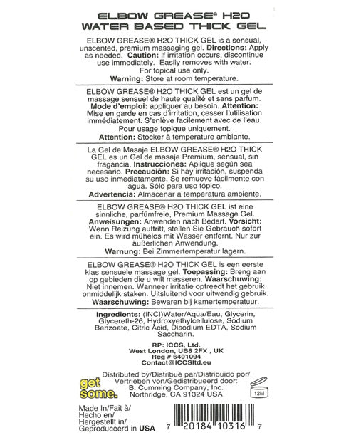 Elbow Grease H2O Thick Gel has a soft velvety smooth texture mimicking the body's own natural lubrication. It is water-based, long lasting, greaseless, safe, latex compatible, odorless and washes of with water leaving no residue on the skin. Keep some handy at all times!