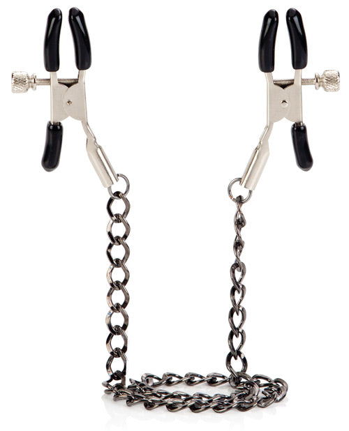 The Nipple Teasers are made from nickel-free iron and consist of a strong metal chain, measuring 12.75”/32.5 cm, with a pair of fully adjustable clamps attached to each end. The clamps are fitted with soft, phthalate-free PVC pads for a comfortable fit. To use, squeeze to open the clamps fully and position directly on the nipples. You can adjust the secure fit by gently twisting the screws. Tightening the screws enhances pleasurable sensations. To test sensitivity even further, you can also pull on the metal chain.