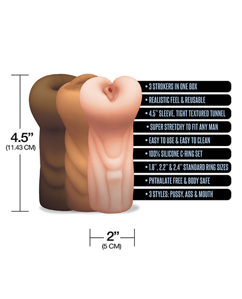 3 strokers in one box. Realistic feel and reusable. 4.5 inch sleeve, tight textured tunnel.