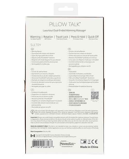 Sultry by Pillow Talk has a smooth rounded head and provides powerful vibrations. It has a tapered insertable handle that rotates 360 degrees for incredible G-spot stimulation. The rotating shaft of Sultry also offers a premium warming feature for added comfort and realism.