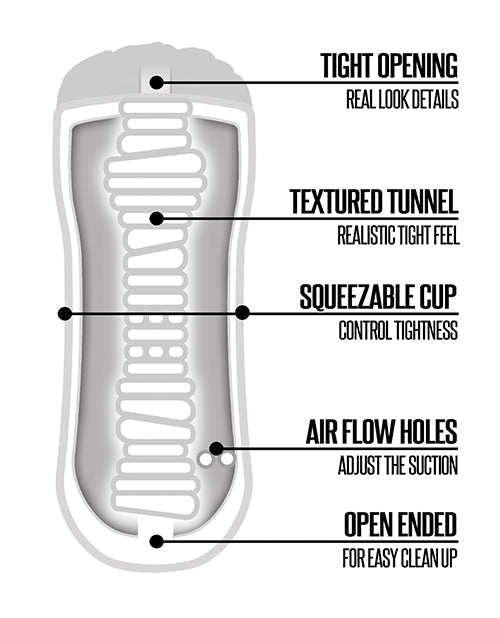 Rinse and repeat. Add lube, stroke, rinse and repeat. Realistic look and feel. Reusable and long lasting stroker. Tight textured tunnel. Super stretchy and waterproof. Use sleeve independently or in cup. Easy to use and easy to clean. Phthalate free and body safe.