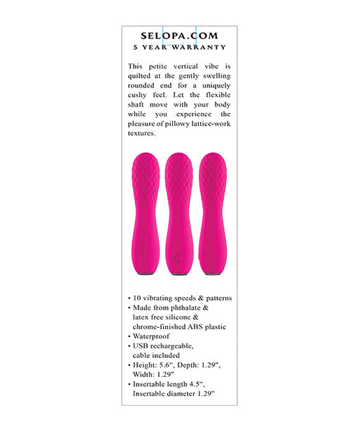 This petite vertical vibe is quilted at the gently swelling rounded end for a uniquely cushy feel. Let the flexible shaft move with your body while you experience the pleasure of pillowy lattice-work textures. 10 vibrating speeds & patterns. Made from phthalate & latex free silicone & chrome-finished ABS plastic. Waterproof & submersible. USB rechargeable, cable included. Height: 5.6“, Depth: 1.29"", Width: 1.29"" Insertable length 4.5“, Insertable diameter 1.29"