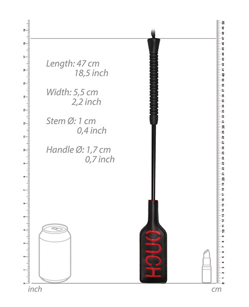 Leave a lasting impression on your partner. This short handled rectangular shaped crop is the perfect way to discipline your partner. Leave a lasting impression on your sub. The word OUCH is reversed so it will show up on their skin.