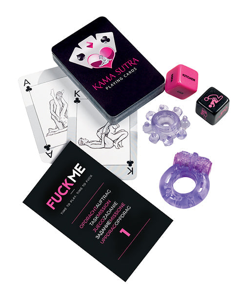 FUCKME is one of the many mischievous games in the ‘XXX-ME' series by Tease and Please. It is aimed at two romantic partners and offers lots of fun and infinite fantasy possibilities. This game allows you to discover positions that re not necessarily obvious, but can feel incredibly good. The attributes that are included will help fire up and/or increase your mutual pleasure, sending sparks flying. The box contains the following attributes: a love ring, a vibrating love ring, and a set of erotic dice. In addition, the game contains six task booklets in ten languages: English, Spanish, French, German, Dutch, Polish, Russian, Italian, Swedish and Norwegian. Last but not least, this game contains a full deck of cards featuring 52 unforgettable Kama Sutra positions. Take a chance and be surprised by the various tasks that focus on mutual pleasure. Every position has its own specific advantages, providing additional stimulation to certain spots. Moreover, they will make you very limber. Tease & Please wishes the two of you lots of playful pleasure! In short, FUCKME is an absolute must for everyone wishing to experiment with various delightful positions, using the attributes that are included. Contains: - 6 Exciting task booklets in ten languages: English, Spanish, French, German, Dutch, Polish, Russian, Italian, Swedish and Norwegian. - Cock Ring - Vibrating Cock Ring - Playing Cards