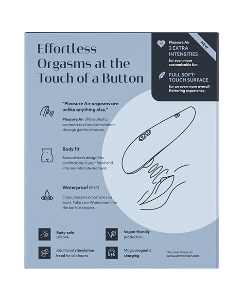 Simple and efficient, Womanizer CLASSIC 2 uses our ground-breaking, original Pleasure Air technology to offer effortless orgasms in record time. 10 Intensity levels - Whether you prefer soft and gentle or powerful and intense, or something in between - your next orgasm is just the push of a button away. The intensity levels are perfectly balanced and offer the right setting for your every mood. Afterglow - By short-pressing the power button, your toy quickly reverts to its lowest setting for a relaxing end to an orgasm. Extra Stimulator Head - We know that every body is different and beautiful! For this reason, every box includes two sizes of stimulator heads to ensure that everyone can enjoy their WOMANIZER.
