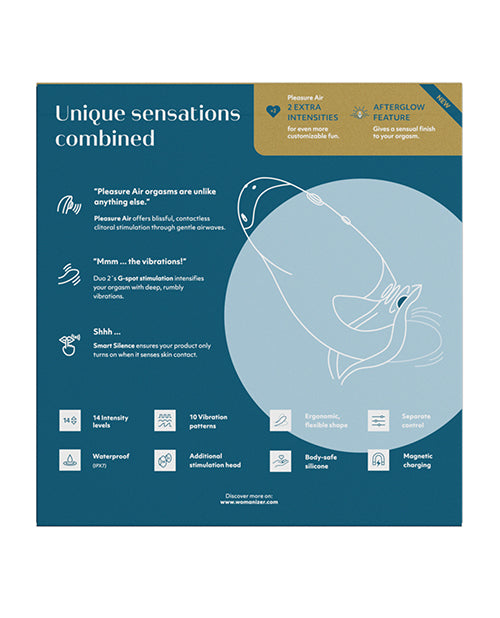 DUO 2 is a unique premium rabbit toy - a Pleasure Air clitoral stimulator and powerful G-Spot vibrator combined to create advanced, blended orgasms. Pleasure Air surrounds the clitoris with pulsating waves and gentle suction leading to a new kind of extraordinary orgasm. Dual Stimulation - DUO 2 simultaneously targets the G-spot with deep rumbly vibrations and the clitoris with suction-like Pleasure Air stimulation, creating satisfying blended orgasms. The flexible inner arm is curved upwards to target the G-spot with gentle vibrations.