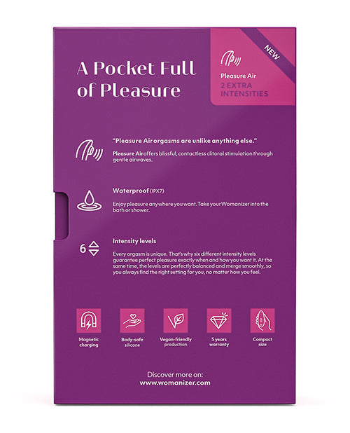 Compact sized clitoral stimulator for people seeking the unique sensations of Pleasure Air Technology. The new Womanizer STARLET 3 - it's the original Womanizer Pleasure Air Technology combined with five new vivid product colors and two more intensity levels, while it's still waterproof and USB rechargeable - for a reasonable price. 6 intensity levels - Every orgasm is unique. That's why six different intensity levels guarantee perfect pleasure exactly when and how you want it. The intensity levels are perfectly balanced and offer the right setting for your every mood. Body fit - The sensual, slim design fits comfortably in your hand and becomes the perfect companion for even the most intimate moments.?IPX7 Waterproof - You want to dive deeper? Since your WOMANIZER is IPX7 waterproof, nothing stands in the way of a long, relaxing bath, a refreshing shower or even a pool party. Materials : ABS plastic made without phthalates, BPA or latex. Dimensions : 117mm x 46mm x 47mm USB rechargeable - Run Time : 30 min Charge Time : 30 min Five Year Warranty.