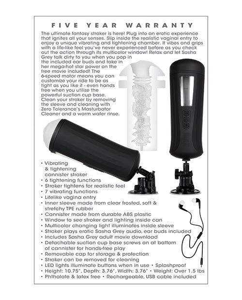 Sasha Grey s Girlfriend Experience. The ultimate fantasy stroker is here! Plug into an erotic experience that ignites all your senses. Slip inside the realistic vaginal entry to enjoy a unique vibrating and tightening chamber. It vibes and grips with a life-like feel you ve never experienced before as you check out the action through its multicolor window! Relax and let Sasha Grey talk dirty to you when you pop in the included ear buds and take in her mega-hot star power on the free movie included! The 6-speed motor means you can customize your ride to be as tight as you like it - even hands free when you utilize the powerful suction cup base. Clean your stroker by removing the sleeve and cleaning with ZT s Masturbator Cleaner and a warm water rinse. Vibrating and tightening canister stroker. Stroker tightens for realistic feel. 6 tightening functions. 7 vibrating functions. Lifelike vagina entry. Inner sleeve made from clear frosted, soft and stretchy TPE rubber. Cannister made from durable ABS plastic. Window to see stroker and lighting inside can. Multicolor changing light illuminates inside sleeve. Stroker plays erotic Sasha Grey audio, ear buds included. Includes Sasha Grey adult movie download. Detachable suction cup base screws on at bottom of canister for hands-free play. Removable cap for storage and protection. Stroker can be removed for cleaning. LED lights illuminate buttons when in use. Height: 10.75, Depth: 3.76, Width: 3.76.Five Year Warranty.
